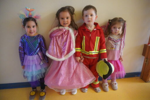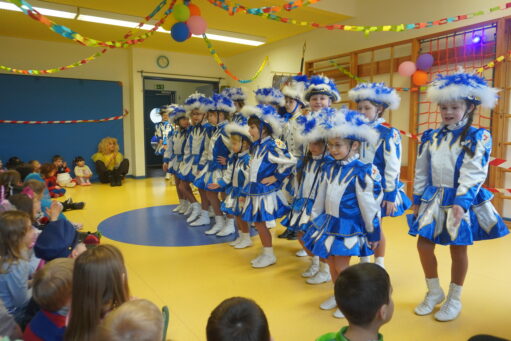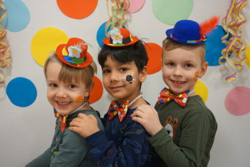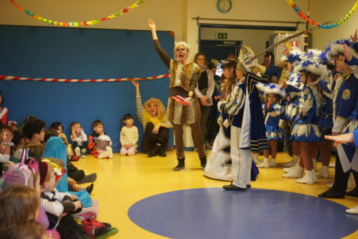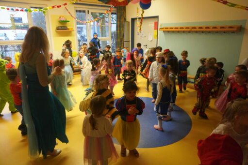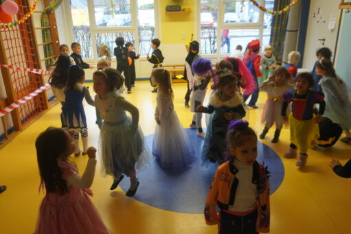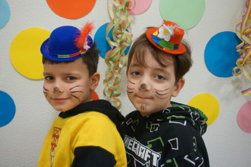An Altweiber und am Karnevalsfreitag wird in der Kita Fasching gefeiert. Alle sind verkleidet! In der Turnhalle wird getanzt und getobt. Im Bistro gibt es ein leckeres Frühstück mit Würstchen, belegten Broten, Fruchtzwergen und Schokoküssen.