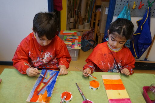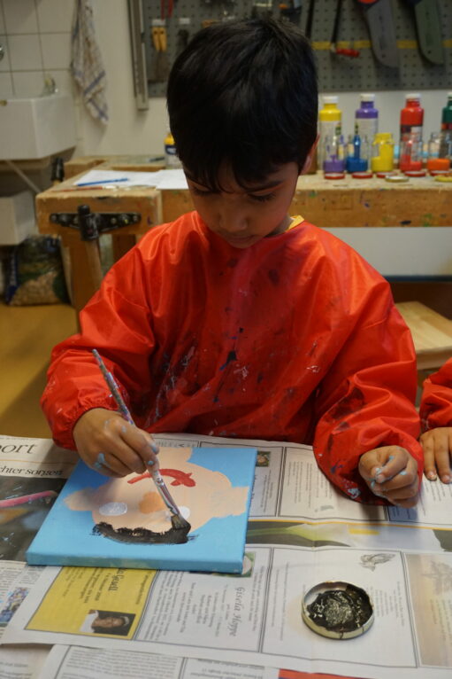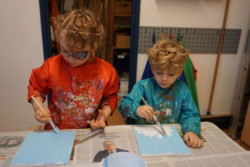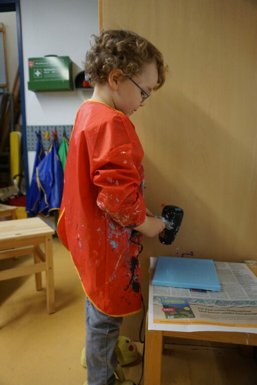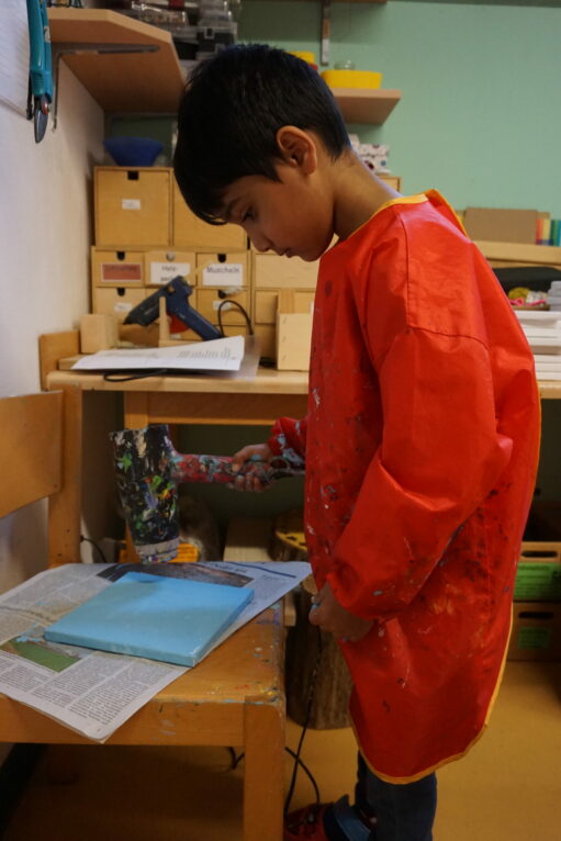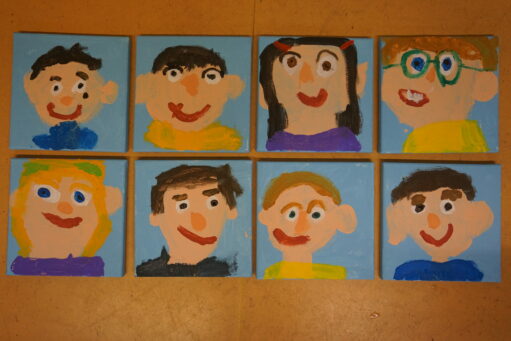 Im Laufe des Vorschuljahres bieten wir den Kindern verschiedene kreative Arbeiten an. Unter anderem gestaltet jedes Kind zu Beginn des Jahres einen Keilrahmen. Im großen Holzrahmen neben dem Büro und gegenüber TP 5, ist für jedes Kind neben seinem Foto ein Platz für ein Selbstportrait auf Leinwand vorgesehen.
