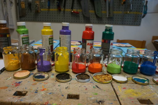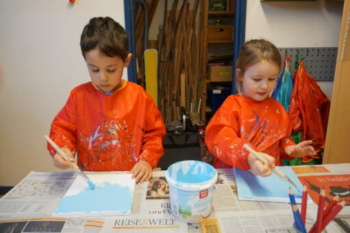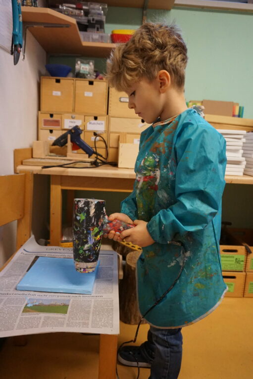 Die Kinder malen mit Abtönfarbe zunächst den Keilrahmen mit der Hintergrundfarbe an. Dann werden die Bilder mit dem Fön getrocknet, bevor der nächste Arbeitsschritt gemacht werden kann.