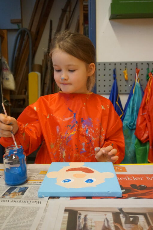 Was für eine Frisur habe ich heute! Welche Augenfarbe ich? Die Erzieherin hilft die Farben anzumischen bis sie den Wünschen der Kinder entsprechen. Dann geht es an die Fertigstellung des Kunstwerkes.