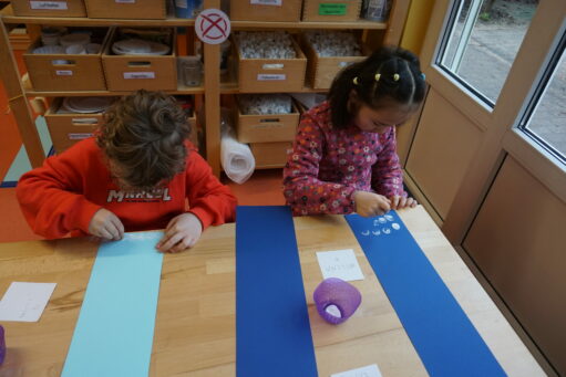 Wir treffen uns mit jeweils sechs Vorschulkindern im Malraum. Eine kreative Mal- und Bastelarbeit steht auf unserem heutigen Programm. Schwerpunkt unserer Arbeit ist das selbstständige Tun. Gut zuhören, Arbeitsaufträge umsetzen, ordentlich und sauber aufmalen, ausscheiden und aufkleben.