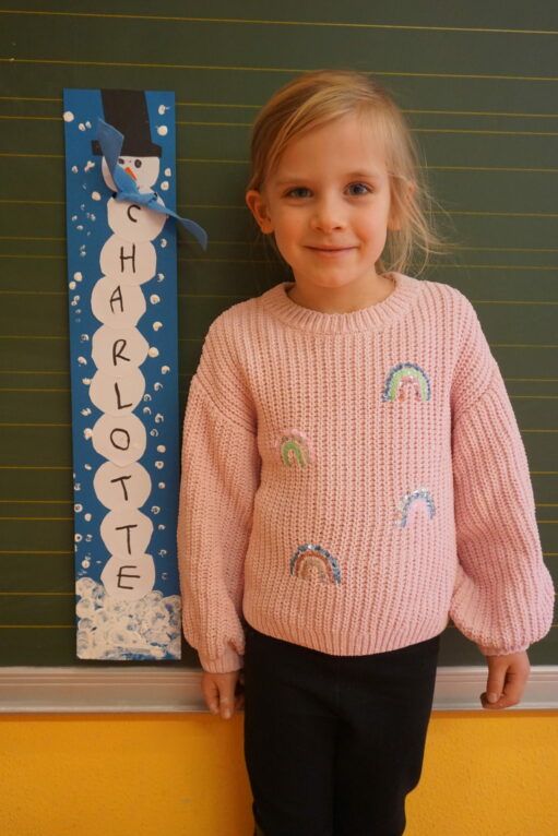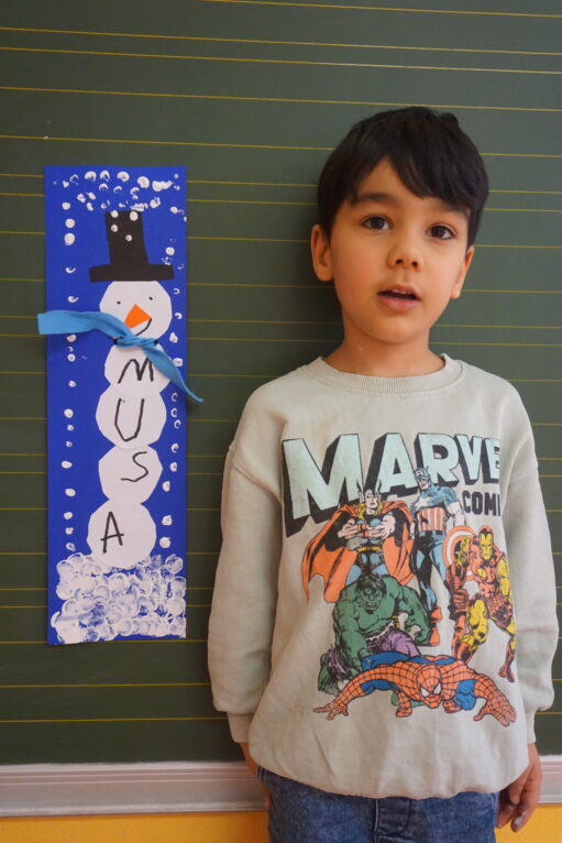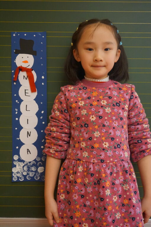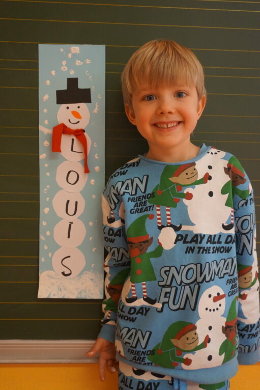 Im Malraum wird ein Schneemann gebastelt, der den Namen eines jeden einzelnen Kindes trägt. Für jeden Buchstaben des Namens muss eine dicke Schneekugel ausgeschnitten und aufgeklebt werden. Zusätzlich eine Kugel für den Kopf, ein Zylinderhut und eine Karottennase. Das Gesicht wird aufgemalt, der Schnee mit Korken und einem Holzstab gedruckt.