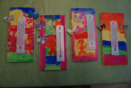 Die erste Aufgabe ist „Male ein Jahreszeiten-Bild“! Das Kind muss sich selbstständig für eine Jahreszeit entscheiden und etwas entsprechendes Malen. Seine Zeichnung wird einen Platz neben dem Foto des Kindes im großen Holzrahmen neben dem Büro haben!
