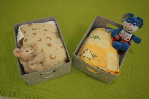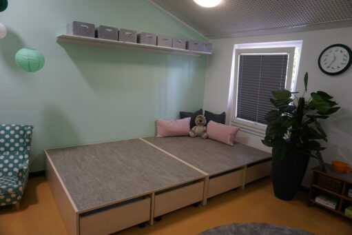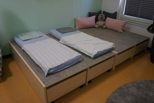Die Besonderheit der Podeste: Sie bieten Schlafgelegenheit für 8 Kinder am Mittag. Die Matratzen werden in großen Schubfächern untergebracht, jedes Kind hat ein Körbchen, in dem seine Bettwäsche, Kuscheltier und Schnuller aufbewahrt werden. So können unser Kleinsten hier in alle Ruhe ein Mittagsschläfchen halten!