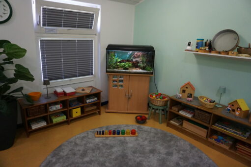 Gerne beobachten die Kinder die Fische im Aquarium. Auf einer Tonie-Box können ruhige Geschichten und Musik abgespielt werden. Die Podeste bieten Gelegenheit auf einer erhöhten Fläche zu spielen.