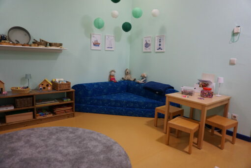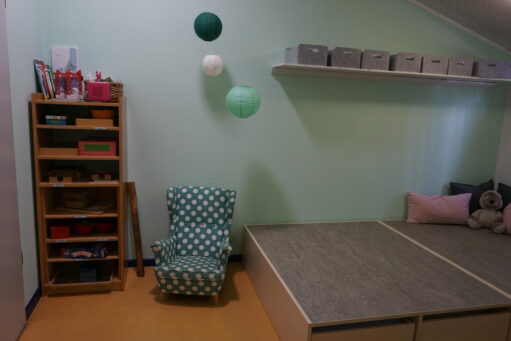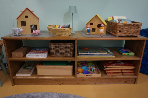 Hier findet eine kleine Gruppe von Kindern in ruhiger Atmosphäre verschiedene Spielangebote vor. Es kann gepuzzelt, mit Legematerial, mit kleinen Gesellschaftsspielen und Baumaterialien gespielt werden. Kleine Püppchen, Häuser und Tiere laden zum Rollenspiel ein. In einer Bücherkiste finden die Kinder Vorlesegeschichten und Bilderbücher.